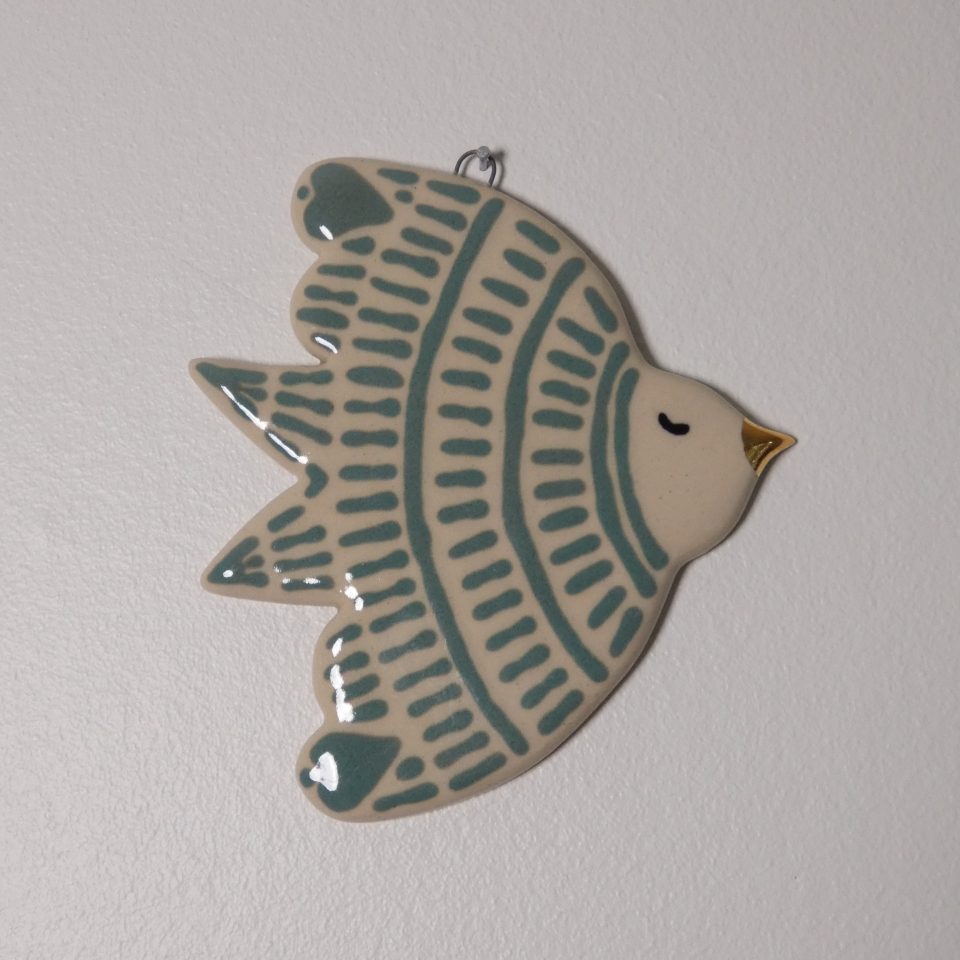 Vægophæng i keramik, formet som en fugl i smukke håndmalede farver med guldnæb og et øje til ophæng – perfekt til at pynte din væg og bringe farve ind i dit hjem.